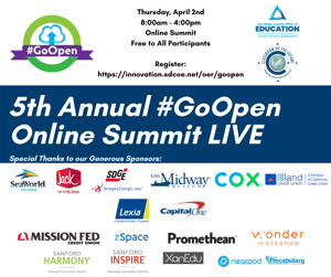 (SDCOE) Innovation division present the Fifth Annual #GoOpen Online Summit LIVE on Thursday, April 2nd from 8:00am – 4:00pm. This summit is a virtual opportunity for the education and business community to learn more about Open Educational Resources (OER) and the U.S. Department of Education’s #GoOpen Initiative.